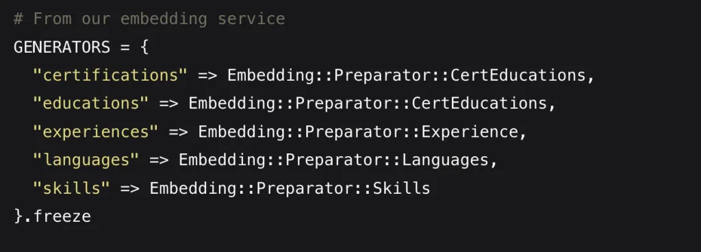 Solution: We moved to multiple embeddings per talent (experience, education, skills, languages), each focused on a specific aspect. This approach recognizes that the embedding space isn’t perfectly calibrated for talent search – it’s a general semantic space where “distances” don’t always reflect business-relevant distinctions. By separating different aspects and weighting them appropriately, we can better control how similarity is calculated.