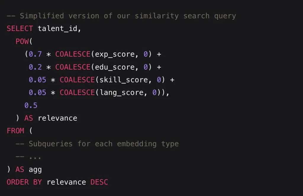 The approach we’ve taken – using multiple embedding points, ignoring potentially misleading information like years of experience, and leveraging PostgreSQL’s vector capabilities – has proven highly effective for talent matching. These same principles could be applied to many other domains where semantic understanding is more important than keyword matching.